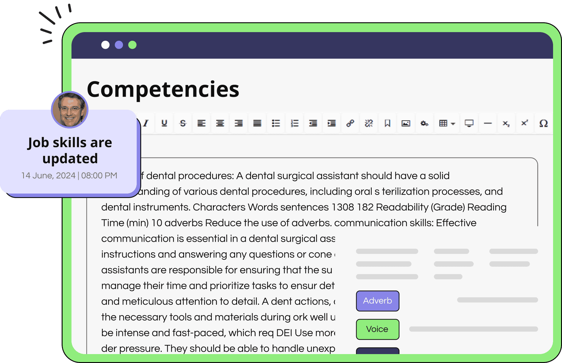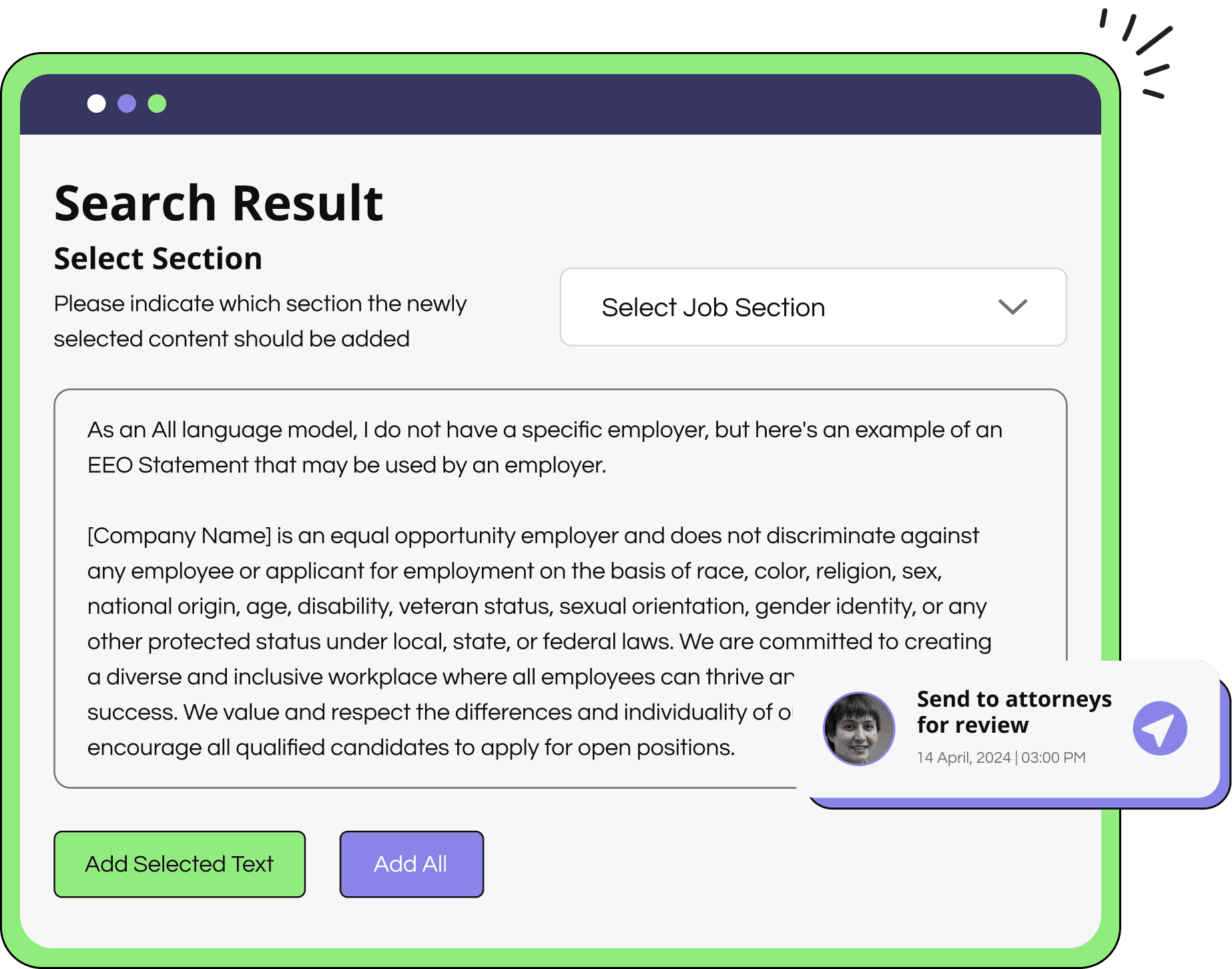 Prompt our AI job description assistant to draft job content in seconds. Then simply select which content you want, where you want it, and make further edits from there.