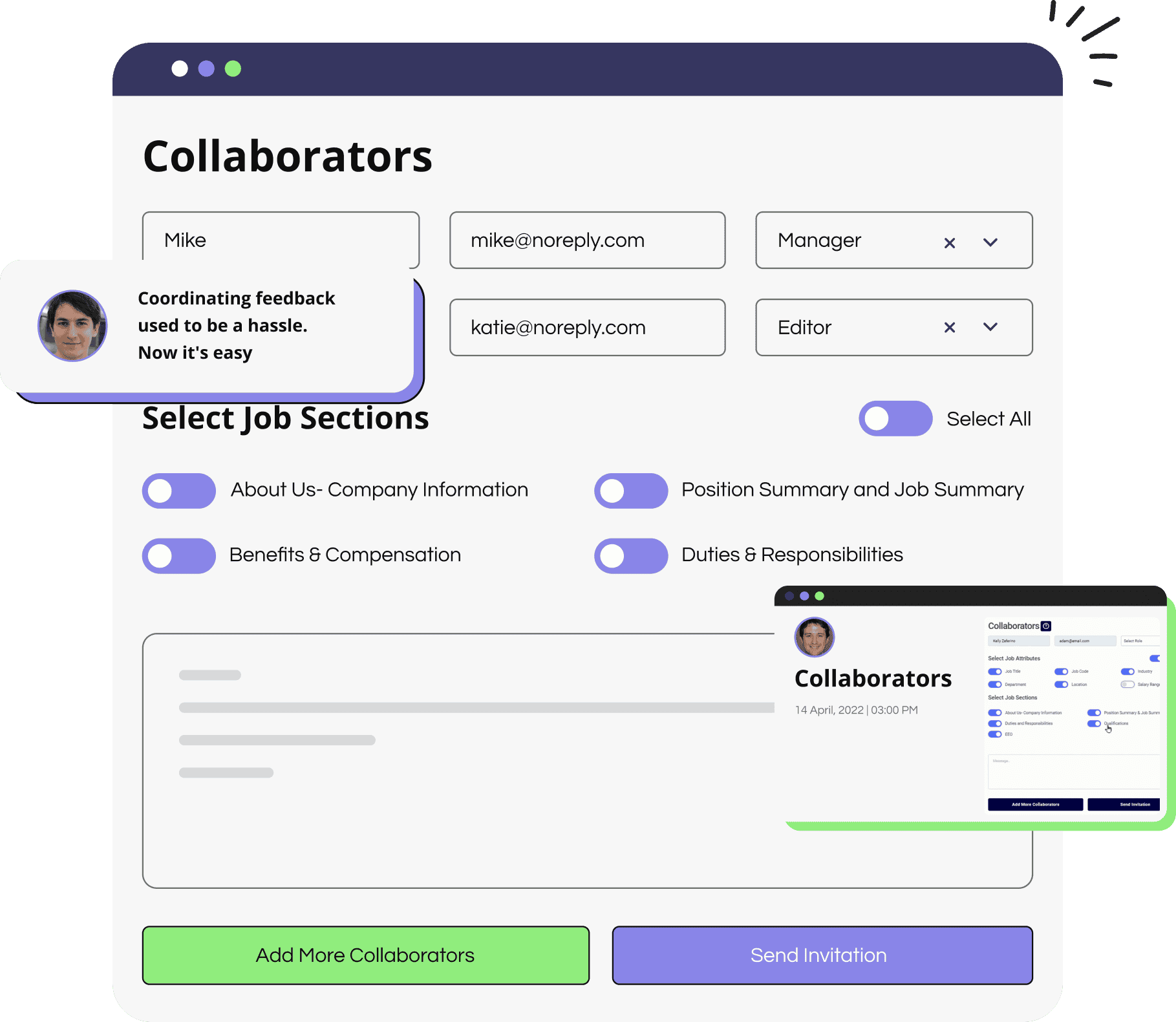 Invited stakeholders access the job description from a URL and provide suggested edits which are automatically sent back to Mosh JD for your approval.